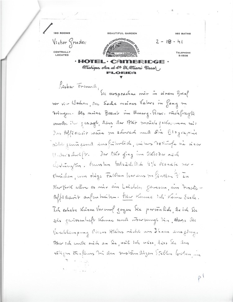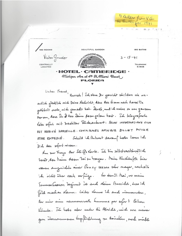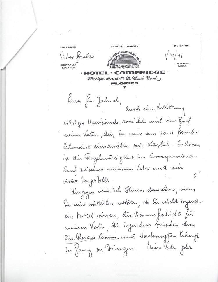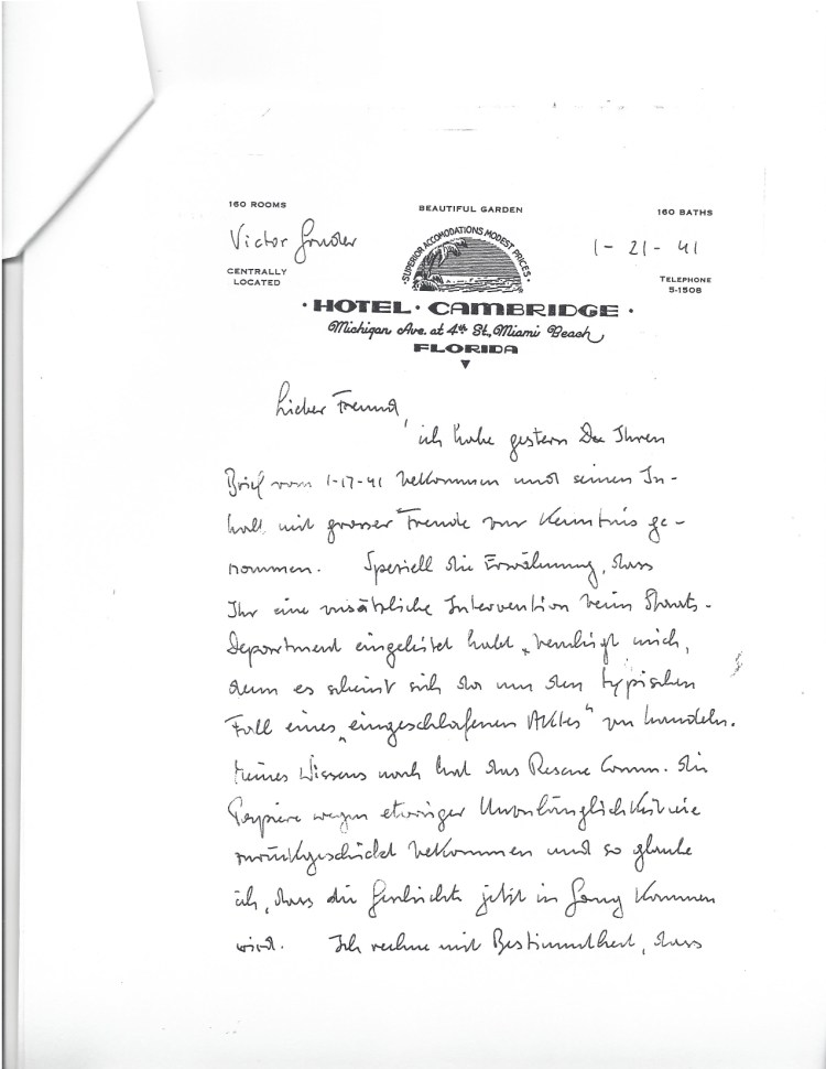 As a matter of fact, thereby hangs a story in which your mother played a great role. I was at the time a waiter in Florida (we were not married,) and I wrote Mommy frantic letters to implore the people in the Austrian Socialist Committee in New York to get my father one of the visums.