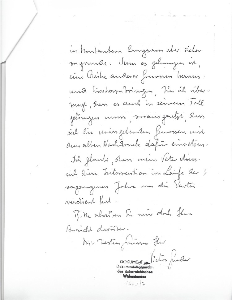 And you can imagine that there was a great demand, and I was exasperated because I had learned in the meantime of the fact that it was by their negligence that my father had remained in France while all of them managed to get themselves to the States. [ed: Victor is referring to the Austrian Socialist Committee getting Cicilia permission to bring Ignaz a blanket as described above, rather than getting Ignaz out of the camp and the country.] I learned this through Edmond Schlesinger, and, by some expression of a bad conscience, I knew that pressure had to be brought. I wrote all this to Mommy and asked her to go and make a scandal because things were moving too slowly, and visums were getting scarcer. And she went and saw Mr. Buttinger, the head of the Austrian socialists in exile, assisted by Julius Deutsch, who had been a general during the Civil War in Spain (he headed the Austrian contingent of volunteers from the Republican side. There also was Count Sforza, former Minister of Foreign Affairs in Italy,) and Mommy marched in there and she let them have it. She made a tremendous scandal, and they were taken aback but it was put on the agenda of the next meeting and my father got his visum. Mommy confessed later that she had no idea who the people were to whom she had talked there. She just let go of how she felt, and it was a good thing she didn’t know because, so she says, had she known, she might have felt intimidated in front of all that brass.