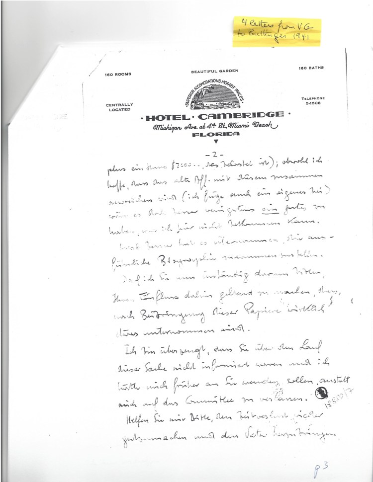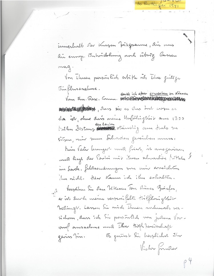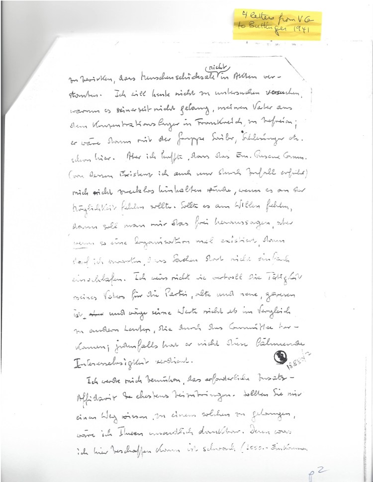 He went to Montauban, where many refugees were assembled because the mayor of that town was a very decent chap. (Incidentally, the Frieds [ed: the parents of a childhood friend of Monica’s; see Letter 11 “Musings on Art”] lived in Montauban at the same time, but the Frieds and my father didn’t know each other.) And there he, at that time, was still able to write me letters because we were not yet at war, and I sent him sporadically checks of small amounts that I was able to scrape together and, with that and the help of some committees, he was able to survive, not very well. He was a very sick man, but he not once seemed to have lost the certainty that I would get him a visum to the United States.