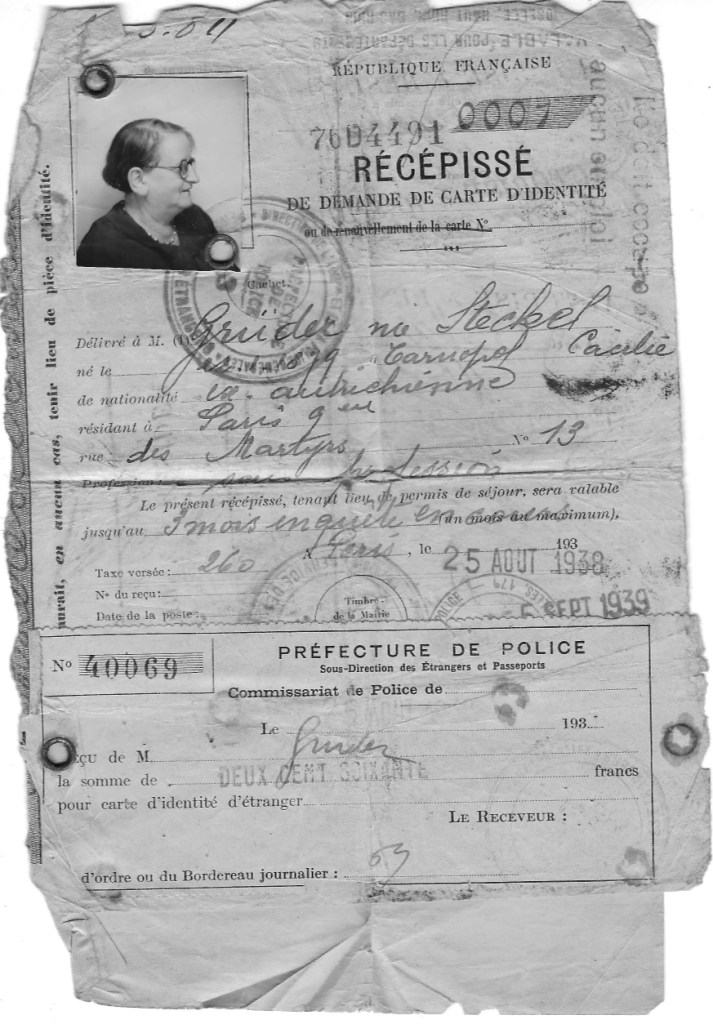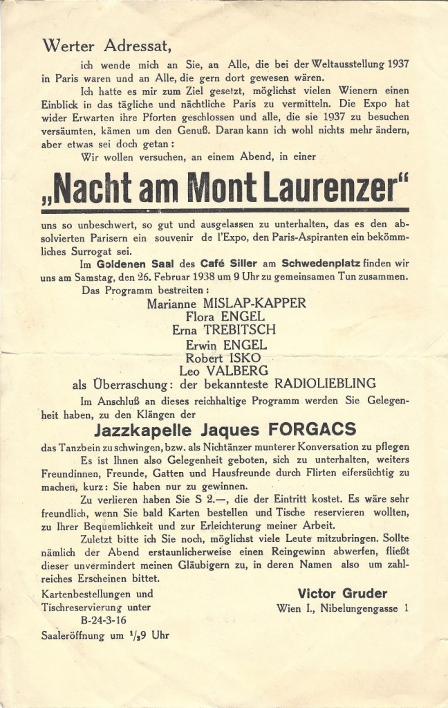 One fallout of being in Paris at the time was that I got myself a carte d’identité, or rather I got a récépissé [receipt, proof of application] for a carte d’identité because it took some time to get the real card. And when, this time armed with a little bit of money, I returned to Vienna and I don’t know what my plans were (besides the fact that I certainly didn’t want to stay in Vienna,) and I organized an evening, a benefit evening, and I made no bones about it: the benefit was to finance my own trip.