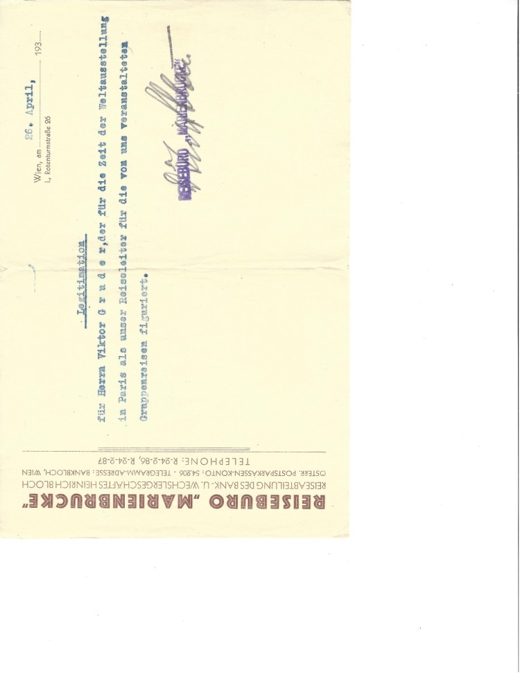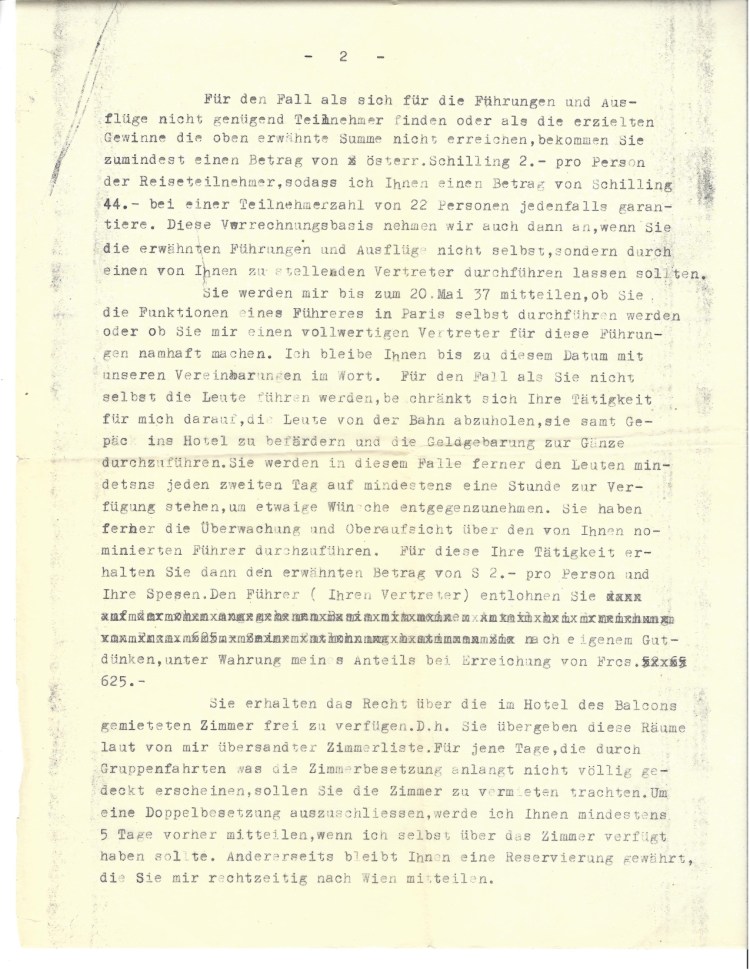 In fact, the man who had this idea was a cousin of Dicky and he went to Paris, rented a fourth-class hotel – or rather, he rented a fixed number of rooms in a fourth-class hotel, booked clients in Vienna and sent them by train to Paris to the World’s Fair. My job (and this was the basis of the agreement we made) was to pick them up in Paris, bring them to the hotel and, after a stay of a week, bring them back to the train where they either would go on to Italy for a week or go back to Vienna. And I was to get ten schillings, which was about two dollars, a head for this service. That was my savings because I couldn’t land a job at the World’s Fair. Unemployment in France was great, almost as great as Vienna and, besides, I had no work permit, so I fell back on this arrangement. Incidentally, this arrangement was interesting for the travel agency, because for every ten people they sent from the train, they got one free ticket for the guide and, sending no guide along but having me in Paris saved them the cost of a ticket, which they then cashed in. That was, I believe, the total margin of their profits.