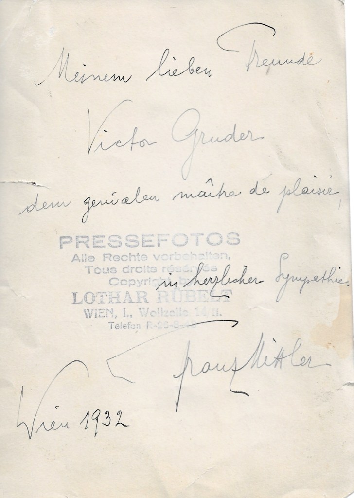 One other amusing experience. There was a concert in town. Joseph Schmidt, he was a little Jew with a golden voice, then very famous in German-speaking countries (no, all over Europe. I recently heard him on the French radio,) and he gave a concert accompanied by Franz Mittler, a good friend of ours. [ed: see Letter 6 “Viennese Refugees” for picture of Franz Mittler at a Gruder home concert.]