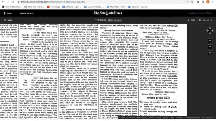 I wrote rather enthusiastic letters during my basic training, letters in which I expressed my admiration for the manner in which civilians who never had handled a gun were in an exceedingly short time turned into soldiers, apparently fairly good soldiers because, after all, we did win the war. (Now, as a matter of fact, my enthusiastic letters were such that Bill Ebenstein felt it necessary to send one to the New York Times for publishing.