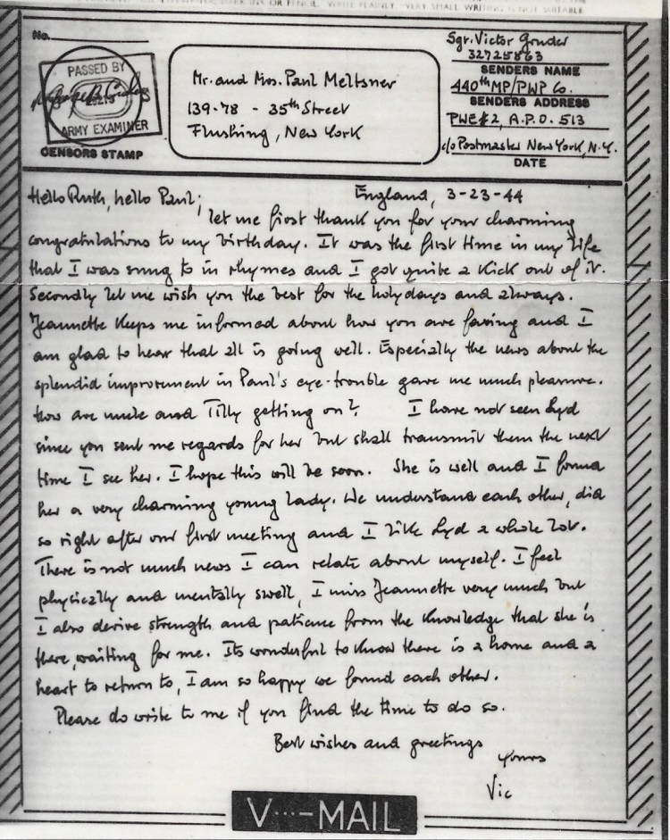 At that time, during one of the obstacle courses, George injured his knee. It was a revival of an old injury he had suffered when he was in the Foreign Legion. Yes, George, who had been a refugee in Paris, had volunteered for the Foreign Legion and that was great misery for him because George is blessed with two left hands, who cannot handle a gun if his life depended on it. And since it said on his papers that he was in the famous Foreign Legion he was the butt of very much fun-making and every time he did something wrong there was great hilarity. And that he fell off the truck somewhere in Algiers caused him a knee injury which then revived on that obstacle course and George was in the hospital and tells me long speeches that some Jewish doctor there wanted to give him a medical discharge and he doesn’t want that because it’s his war and he has to fight it and he doesn’t want to leave the army, and I had a hell of a time persuading him that as a journalist he would do a greater contribution, make a greater contribution, than as an inept soldier. Eventually I was able to persuade him. George was released from the hospital on medical release and, three weeks later, with a rank of — as a civilian foreign correspondent with a rank of major (he was a private in the army) he was sent to London where he worked for the War Information Office. And incidentally, much later, one day on the street he saw the man, our former captain (the umpire guy) who had meanwhile made major and George took great pleasure in the fact that he now ranked him and, very condescendingly, patted him on the shoulder and said, “Oh, hello, Toplin[? Toffler? Tofflin?].” Now that much for George. [ed: George Herald went on to have an important career as a journalist, including covering the Nuremberg trials.]