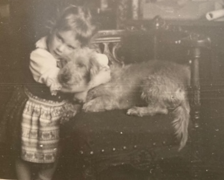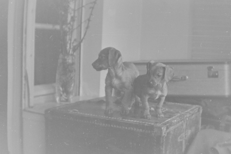 Now after this little footnote (and, by the way, footnotes we didn’t have yet,) let me make another nachtrag – that’s cheating because nachtrag means nothing but postscriptum – we had, both in Düsseldorf and later in Paris, our dogs with us and I haven’t even spoken how we acquired our dogs. I haven’t mentioned that. Well, as Mommy is fond of telling, that she knew that I was, I always desired to have a dog and I’d been speaking particularly about a dackel [ed: dachshund]. I had a dog in Vienna. It was a, it was as much of a German Shepherd as Graupi was a dackel but I loved that dog very much and I wanted one. And Mommy wanted me to come back from the war hale and well, and she wrote me once in a letter, “Well, if you come back and all goes well, you can have your dog.” Well, I had long forgotten about this and there was no way of having a dog in New York, and then in Germany, not long after Mommy and my father arrived, I was sick in bed — some minor throat thing or something, but sick in bed — and I believe it was my birthday. So, it was definitely in the winter when Mommy came home with two puppies. They had been sold to her by a — given in for choice by a — kennel that swore up and down that these were rauer haardackel and I was to choose one or the other.