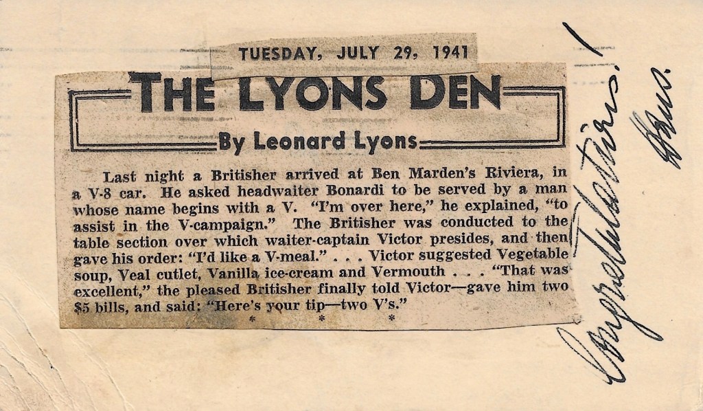 In Florida I was hired into one of the kosher hotels as a captain of waiters. I went down in the car I had acquired, took along Otto Neumann [ed: the same Otto Neumann Viktor fled Vienna with, who remained in Milan when Viggi and Viktor proceeded to Paris] as a busboy. And, at that time, Florida not only did not have any organized unions in the hotel business, any union organizer found in Miami was run out by armed policemen on a truck to the frontier of Florida and most clearly told that he better not come back, with some cop shaking a gun into his face. And, usually, they didn’t come back. So, the conditions under which we worked there and lived there were incredibly bad. You paid for your own hotel room somewhere in a ninth-class hotel, you got a minimum wage (which I don’t know whether it amounted to a dollar a day,) and you got food, all you could eat, although there were limitations put on what you can get. Everybody, including the kitchen help, hated the boss so you got even with the stingy boss by eating the most expensive things if the people in the kitchen gave it to you. And otherwise, you lived on the tips you made.