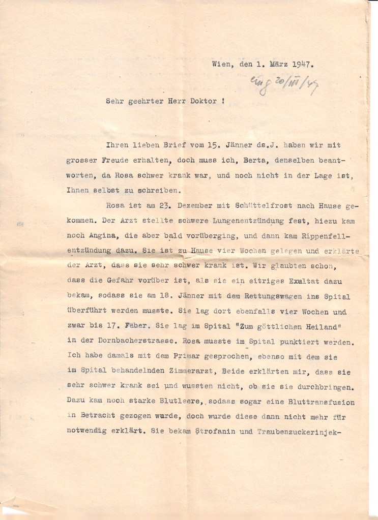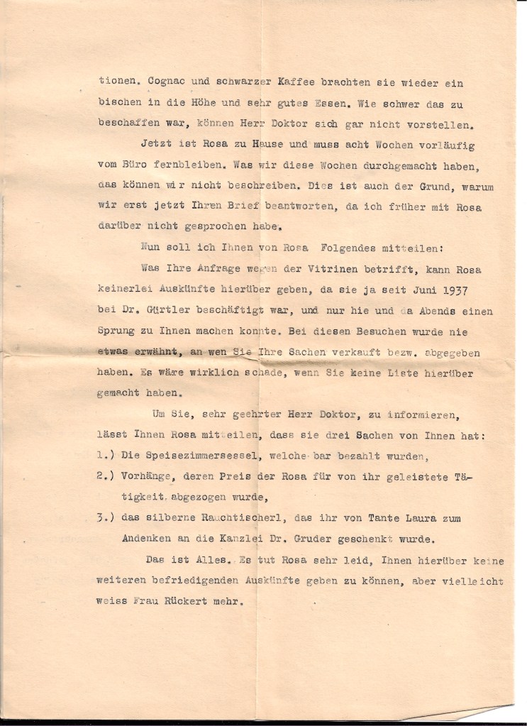 One of my next visits was to our former office directrice. I rang the bell, and an old woman opened the door, and I asked whether I could speak to Rosa, and she told me she was Rosa. It was quite a shock. I guess my shock must have shown because she cried. As I looked around, I saw the apartment furnished almost entirely with the furniture of my Aunt Laura and to preclude any questions, she immediately volunteered that Laura had given her that furniture to keep for her until she would return from the concentration camp, if she was arrested — which she of course was — and that she, Laura, had told her that if she doesn’t come back, she can keep the furniture. Well, I did not insist on anything. In fact, I didn’t as much as comment on this very unlikely story. I accepted the one, single small rug which she said she had been given by my parents to keep and, I believe, also two paintings. I forget which. I think one was an old man, something that Henry has, I think. I left and never got in touch with her again. I was so disgusted that I didn’t want to see her or hear of her again.