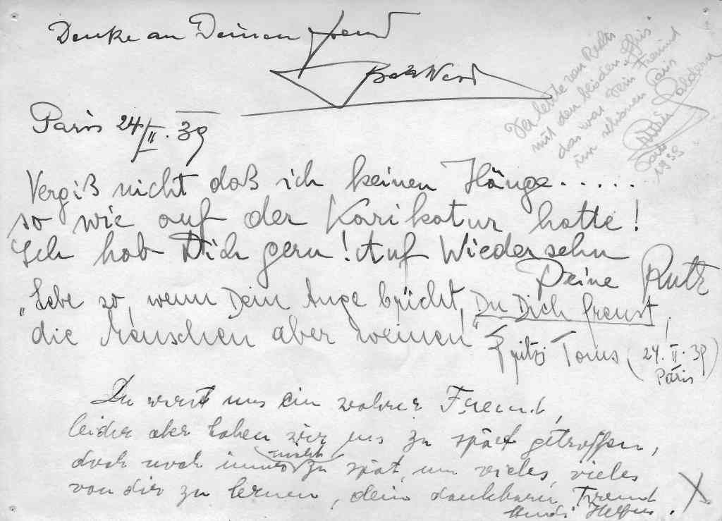 But after a few months of this I got word that my father had not only gotten out of prison but that they were able to get a visum for France, both my parents, and they would be arriving – I must confess, I don’t remember exactly the date. My father’s release, or rather his arrest and release, are a story in itself. He was arrested the day after we, that is Otto Neumann, Viggi Kalmus, and I, had left for Italy. The next morning police were in our house; had I been there, I would have been arrested with him. And, luckily, he was again put into a police prison, not into a concentration camp. And by some lucky coincidence one lawyer, a fairly young man who had been a Nazi (or rather, a lawyer defending illegal Nazis,) had at one time asked my father, who was by many years his senior, for some advice about political trials (for which my father was well known,) and my father had given him some information. That man, after the advent of, after the Nazis coming to power, either noticed or had heard that my father was arrested (he had meanwhile become a prominent Nazi official,) and on his own volition, intervened and obtained the release of my father who was sent home.