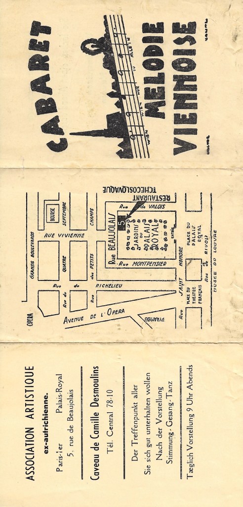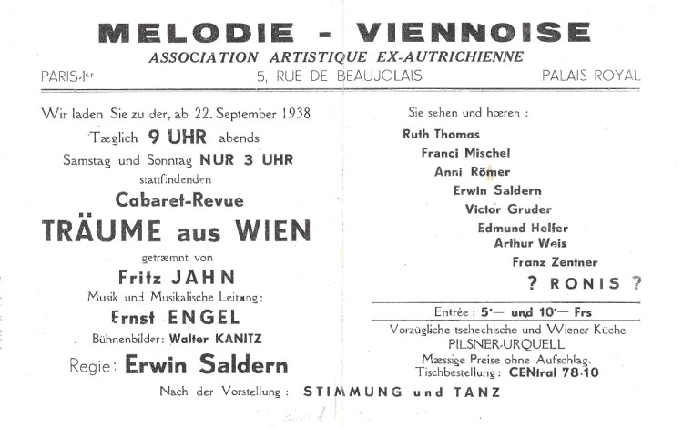 But coincidental with that employment, the arrival of my parents in Paris, the rental of a small apartment (a furnished apartment,) on the Rue des Martyrs in which the three of us lived, brought another occupation for me. There was a group of Viennese cabaret people and actors. None of them had permission to reside in Paris. They all were supposed to reside in Mélun or somewhere near Paris but of course were illegally living in Paris. One of them had been a rather prominent entertainer in Vienna, a comedian, very funny guy. Not very bright but very funny, and he had brought with him numerous sketches that he had played in something like Vienna’s Lido or the Fémina and he had the idea to band together all these unemployed refugee artists and to mount a Viennese revue show, a nightclub sort of thing, in Paris as entertainment for other refugees.