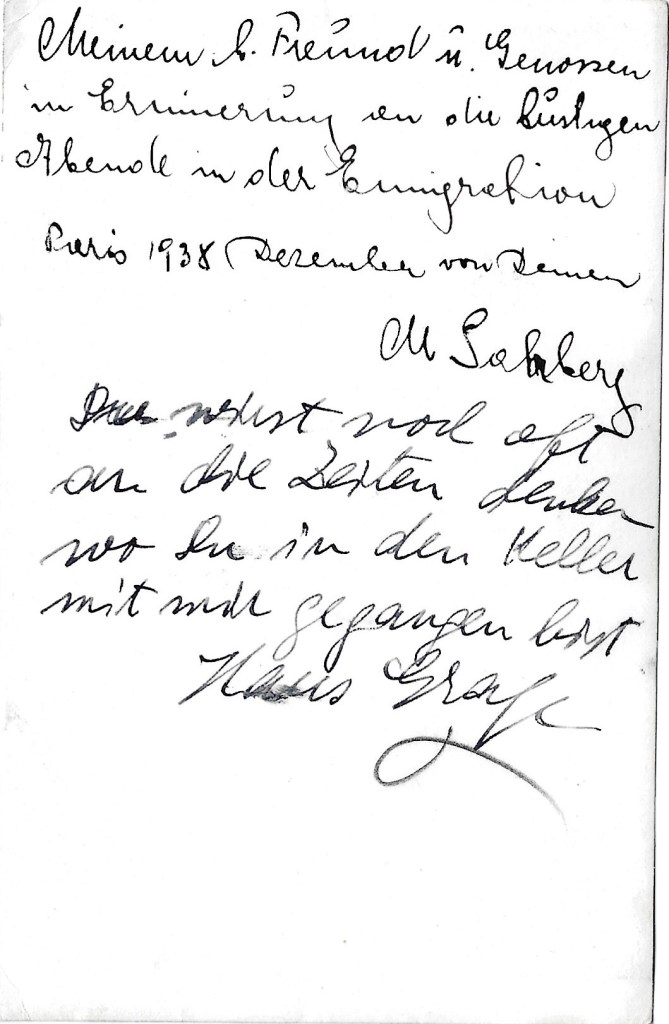 Well, I had tried my hand at a number of things. I gave German lessons to one industrialist and also to the son of the hotel owner (who took it off my hotel bill.) You know the funny thing is, it never occurred to me at that time to wonder why a French industrialist would, at the ripe age of forty or so, suddenly start taking German lessons. He was, apparently — he showed more foresight than most Frenchmen and I find it curious today that it never struck me as curious at the time. Well, I wasn’t earning much. We augmented our income by my entertaining in some German clubs. That is, some German Jewish refugees had some loosely knitted social organizations and clubs in the back rooms of some cafés and there I would, with Viggi Kalmus at the piano, sing little ditties which I had myself written or which I shamelessly copied from some Viennese entertainers. It was usually only a few friends, but it was important experience which came in handy later.